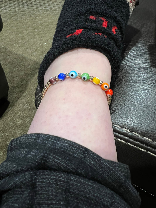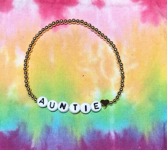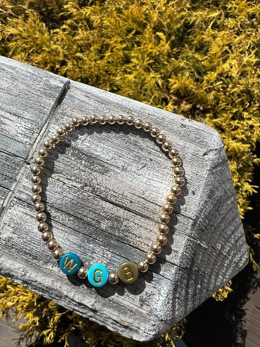4mm gold ball bracelet with mint, blue, teal and green with gold letters