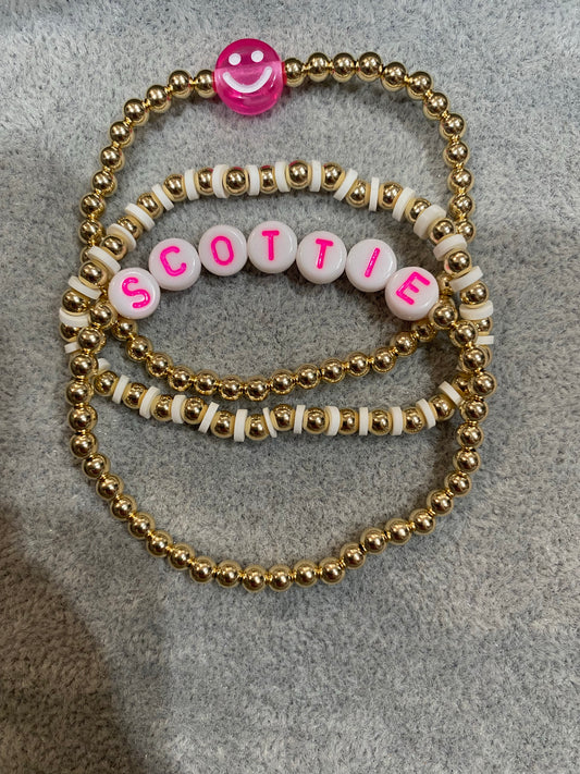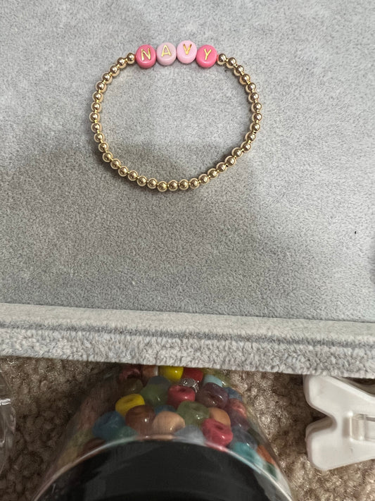 4mm gold ball bracelet with rose, pink with gold letters