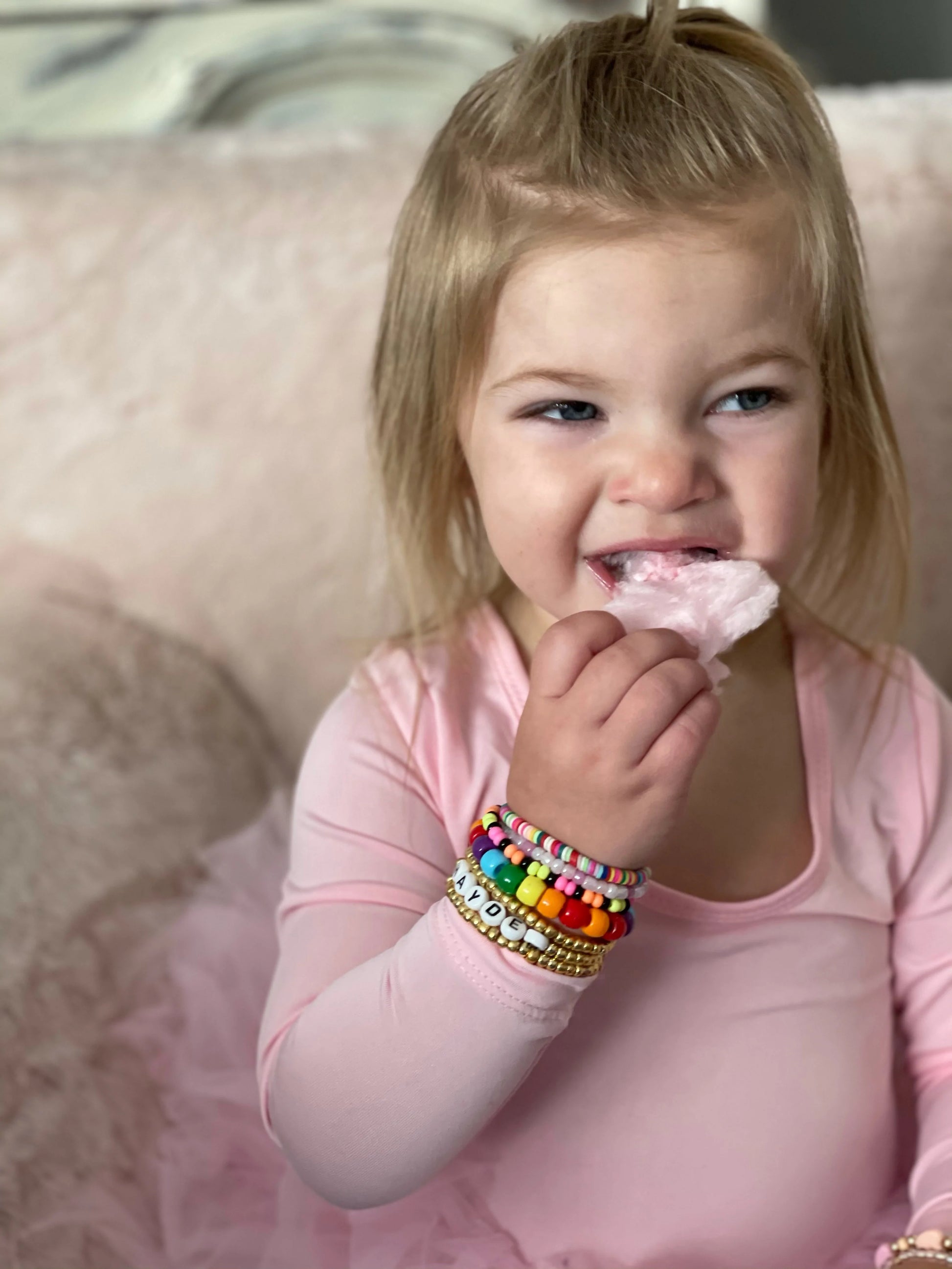 This is the Mini Triple G Bracelet made for little ones! Instead of our one-of-a kind natural stone beads, this bracelet has plastic pony beads and has a stretchy string as they are toddler-resistant!